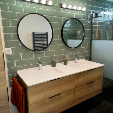 Actuelle et dynamique, cette collection présente des meubles de salle de bain sur mesure de haute qualité aux lignes sobres et épurées. Ce sont des meubles le plus souvent suspendus dans des matières, finitions et couleurs actuelles. Utilisation des matières type industrielles pour permettre d’obtenir des meubles des plus ambitieux. Meubles bois et étagère murale en métal, meuble industriel laqué noir… Découvrez nos idées déco pour un mobilier design dans votre salle de bain ! Comme toutes les collections, ces meubles sont entièrement personnalisables selon votre style et coloris. Ils sont réalisés sur mesure à vos dimensions.