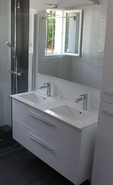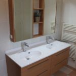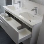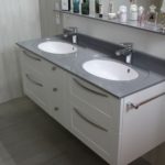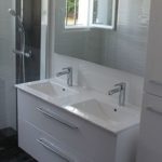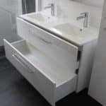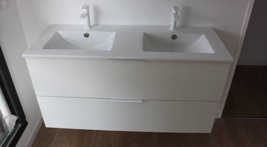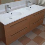 Voici des exemples de réalisations double vasques en céramique sur des meubles contemporains suspendus.