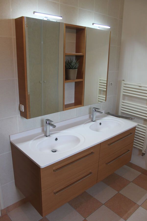 Autre exemple de meuble suspendu double vasque avec des façades en imitation bois.