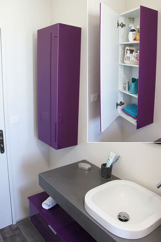 Les meubles de rangement, composés d’un tiroir et d’une armoire également suspendus, sont réalisés en verre extra-clair laqué. La teinte est entièrement personnalisable selon les envies du client, pour une harmonie parfaite avec l’espace.