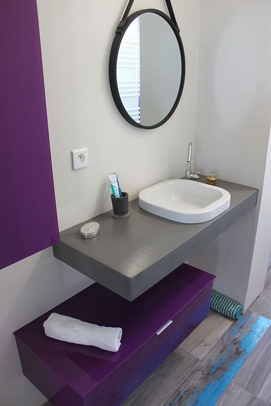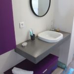 ⊕ Le plan de toilette suspendu en béton ciré est une solution design et sur mesure, idéale pour s’adapter aux contraintes des petites salles de bains.