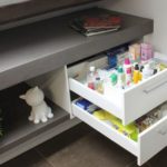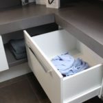 - Le retour d’angle avec une grande profondeur pour des grands tiroirs (dont un panier à linge).