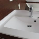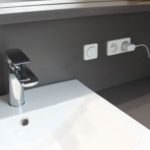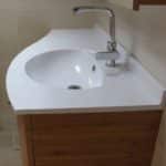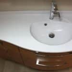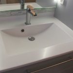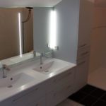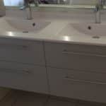 - La remontée au mur et sur le côté gauche du plan de toilette en résine.