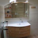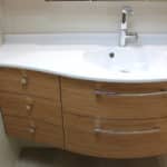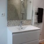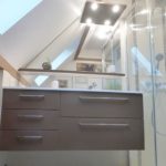 Pour agencer cette salle de bain, nous avons réalisé un meuble galbé suspendu avec une armoire de toilette adapté à la sous pente de toit.