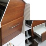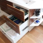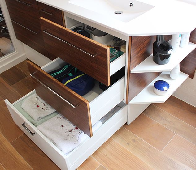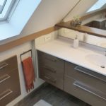 Nous créons des meubles sur mesure avec des rangements astucieux pour l’aménagement de salle de bain sous rampant. Avec notamment des tiroirs grandes profondeurs dans le meuble pour utiliser au maximum l’espace disponible.