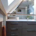 Dans cet exemple la vasque est décentrée pour se trouver à l’emplacement le plus haut. Le miroir est recoupé sur mesure pour suivre la pente du toit.