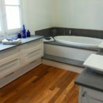Dans cette grande salle de bain, nous avons conçu un meuble double vasques accompagné de trois meubles hauts, pour allier rangement optimal et esthétique soignée.