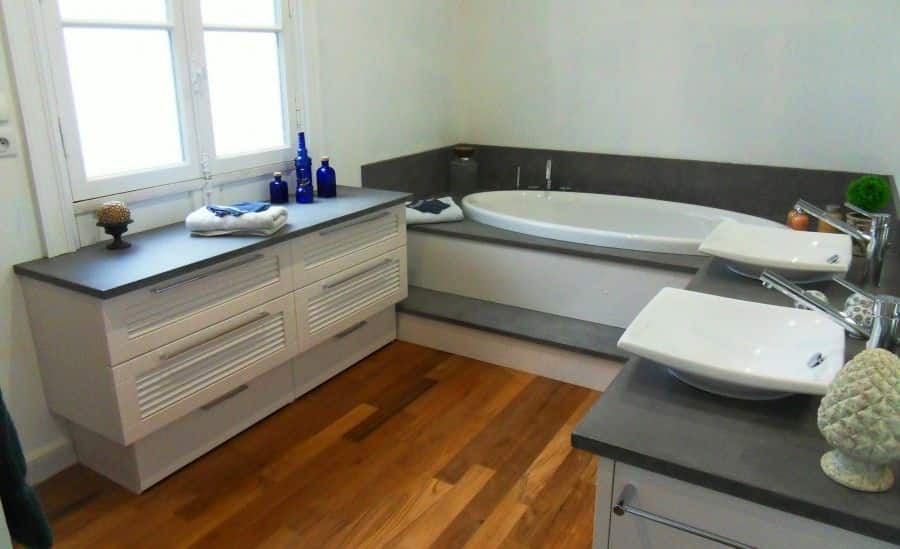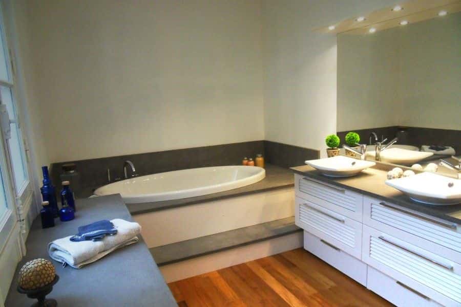 La baignoire est habilement encastrée dans un plan en béton ciré, identique à celui du meuble, pour une continuité esthétique parfaite.
