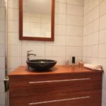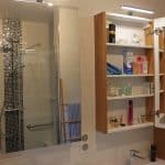 Pour maximiser l’espace sur le plan de toilette, la vasque et le miroir ont été décalés sur le côté, offrant ainsi une surface plus généreuse.
