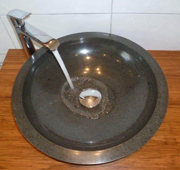 La vasque, elle, est réalisée en marbre naturel gris anthracite, apportant une touche d’élégance et de contraste à l’ensemble.