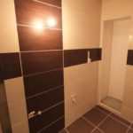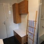 Un banc en bois massif avec tiroir a également été réalisé, offrant un espace pratique à proximité de la douche.