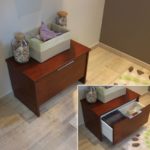 L’aménagement d’une zone de change pratique, équipée d’un grand coffre de rangement à tiroirs avec panier à linge intégré, complété par des meubles suspendus pour optimiser l’espace et faciliter l’organisation.