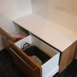 La prise électrique intégrée et cachée dans le meuble colonne, alliant sécurité et fonctionnalité.