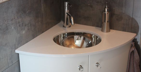 Voici un lave-mains d’angle installé dans des WC, équipé d’un meuble en 1/4 de rond avec une vasque en inox collée sous le plan de toilette en résine.