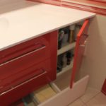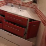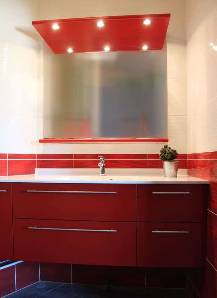 Le meuble est entièrement personnalisé avec une couleur rouge rappelant la faïence.