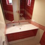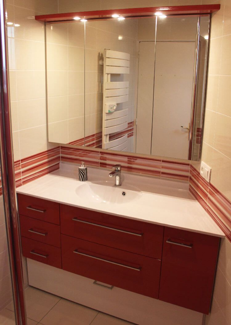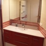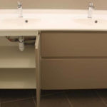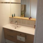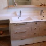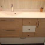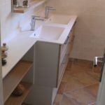 Pour facilité l’accès au meuble de salle de bains le passage est libéré par un plan de toilette plus étroit. Cela présente l’avantage de conserver un meuble installé entre murs.