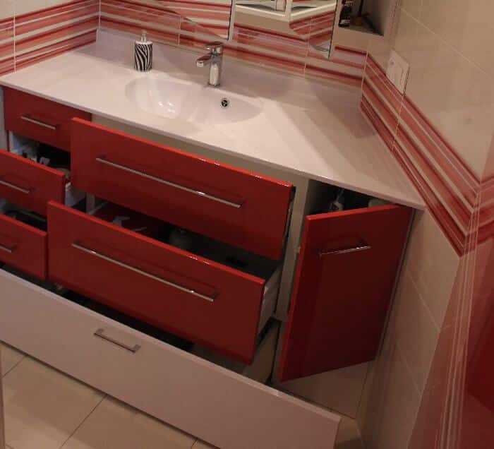 - L’adaptation parfaite du plan de toilette et du meuble à l’angle de 135°