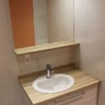 Le meuble se trouve entre murs avec un emplacement entre la douche et l’entrée de la pièce. Pour libérer du passage, un décrochement du plan de toilette a été réalisé.