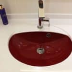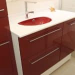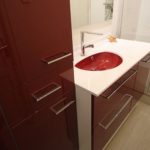 3. Un meuble rouge et blanc pour une très petite salle de bain !
