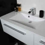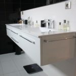 Voici un meuble au design épuré dans une salle de bain chic et tendance. Les couleurs du carrelage et de la faïence, noir et blanc, créent un contraste entre les murs et le meuble.