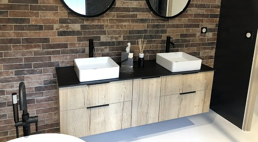 Pour s’accorder à la tendance industrielle des verrières, les plans peuvent être réalisés en résine, métal noir (uniquement disponible avec une vasque à poser) ou stratifié fin.