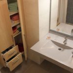 Voici un exemple de salle de bain accessible en fauteuil avec un meuble sur mesure pour personne à mobilité réduite (PMR).