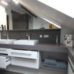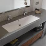 L’usage du béton ciré dans la salle de bain apporte une ambiance minérale moderne. Les nombreuses étapes de fabrication du béton ciré fait de chaque meuble sont authenticité et sa particularité. Le plan de toilette en béton ciré est épais et souvent associé à un ou deux jambage. Ces types de plans nécessitent un essuyage régulier pour éviter son usure prématurée.
