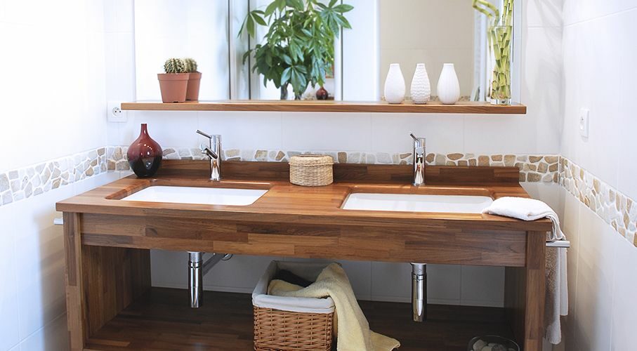 Tablette miroir et bandeau lumineux en teck lamellé vernis.
