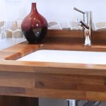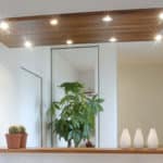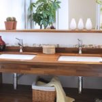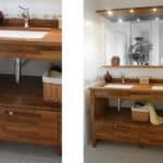 Tablette miroir et bandeau lumineux en teck lamellé vernis.