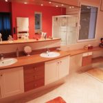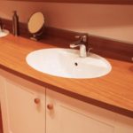 Plan toilette galbé stratifié bambou avec 2 vasques « Odéon » collées sous stratifié.
