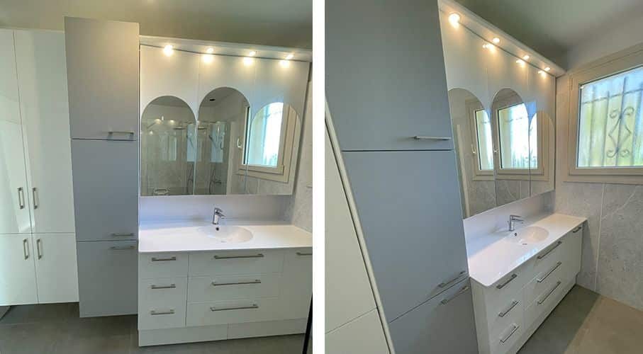 Meuble de salle de bains entre cloison à droite et placard à gauche.