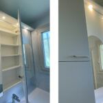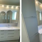 Meuble de salle de bains entre cloison à droite et placard à gauche.