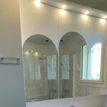 Dosseret hauteur 30 cm – vasques moulée ovale centrée - Armoires de toilette 3 Portes miroirs– 12 étagères.