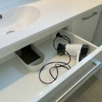Pris de courant pour sèche cheveux dans le tiroir du haut. - Meuble sous-plan 1 tiroir panier à linge.