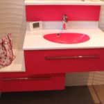 Plan de Toilette résine « Solid Surface » blanc satiné avec vasque Ellipse Fushia Ral 4010.