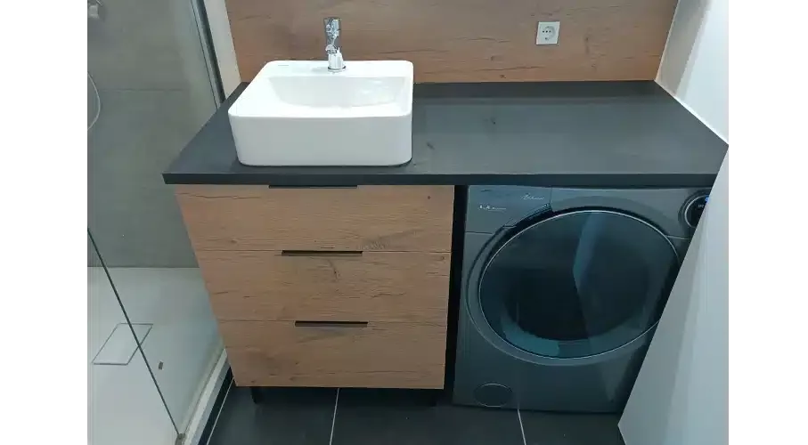 Meuble de salle de bain avec lave linge intégré sous plan à droite entre le mur et la paroi de douche.
