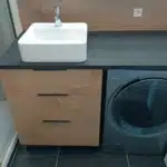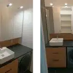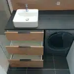 Meuble de salle de bain avec lave linge intégré sous plan à droite entre le mur et la paroi de douche.