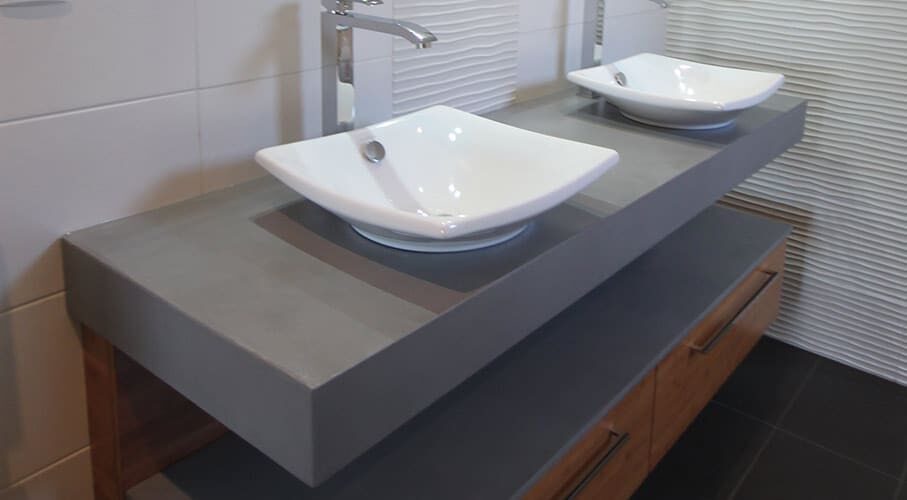 Plan en panneau de particules hydrofuge, recouvert d’un enduit minéral béton gris « Baho ».