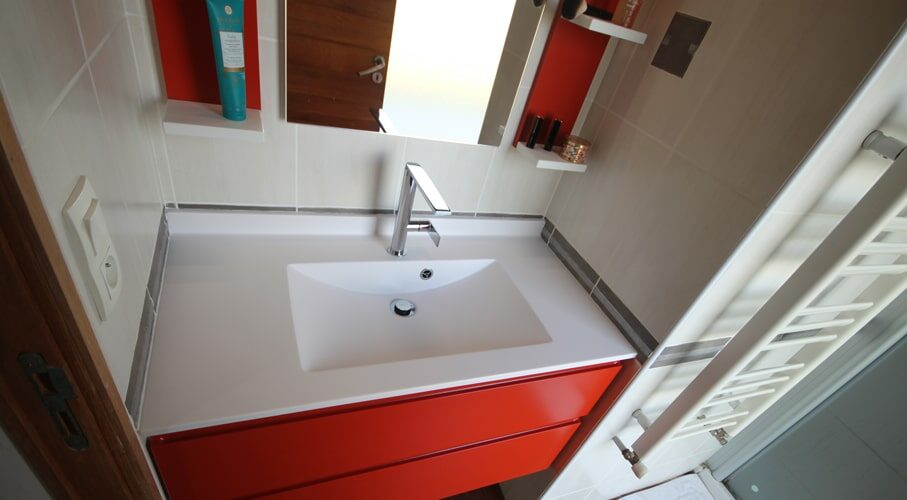 Plan de toilette en Résine Solid Surface blanche satiné avec dosseret (remontée) vasque madrid.