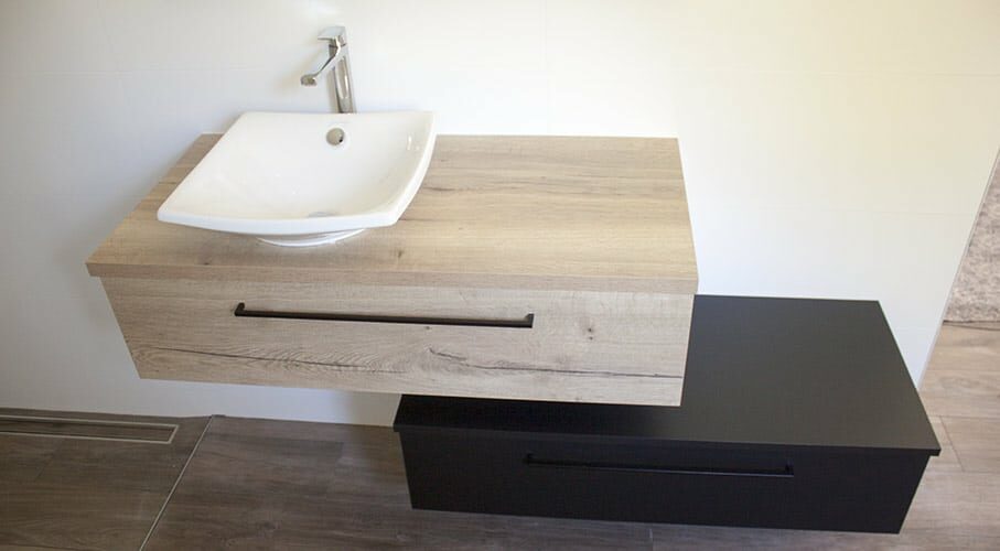 Atlantic Bain réalise des meubles de salle de bains suspendus modulables pouvant s'installer en fonction de l'espace de votre salle de bains. Toujours tendance le chêne Halifax et le noir mat.