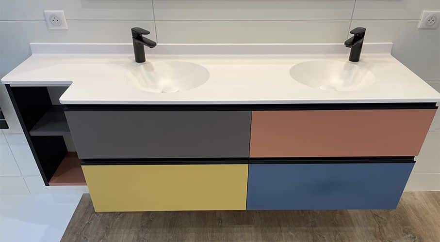 Dosseret hauteur 5 cm – 2 vasques moulées Doma Ø 36 cm sans trop plein Angle arrondi R 2cm - Bonde à écoulement libre avec dessus en résine idem plan