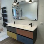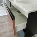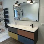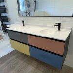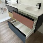 Largeur 70 x hauteur 56 x profondeur 49 cm Profondeur tiroir du haut 40 cm – Profondeur tiroir du bas 40 ou 45 cm suivant la tuyauterie Façades laquées satiné mat suivant faïence – Caisson mélaminé blanc – Coté visible laqué idem façade. - Poignée prise de main profil Alu noir mat – Largeur 70 cm