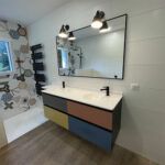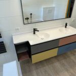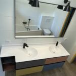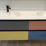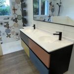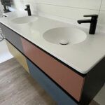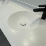 Dosseret hauteur 5 cm – 2 vasques moulées Doma Ø 36 cm sans trop plein Angle arrondi R 2cm - Bonde à écoulement libre avec dessus en résine idem plan