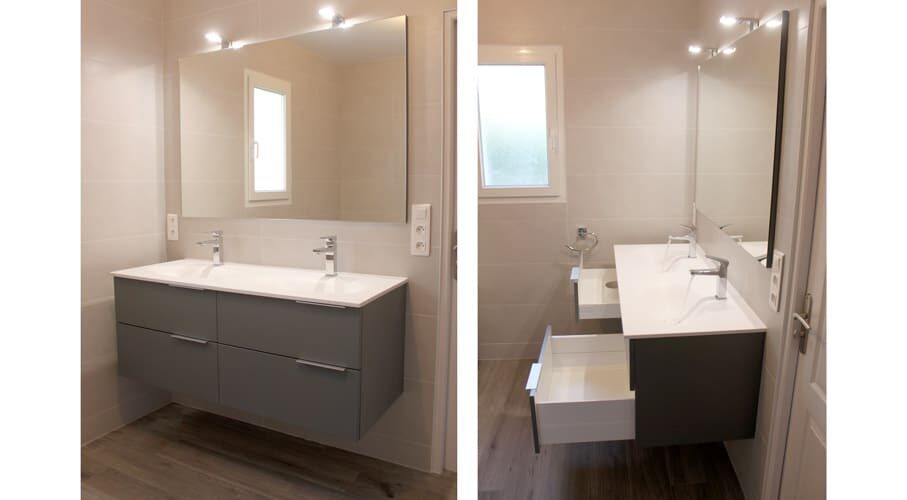 2 vasques Cocoon avec trop plein invisible. Plan sans dosseret. - Miroir solo larg 130 x haut 90 x ép 2,5 cm – chant laqué gris idem façades