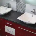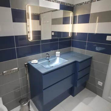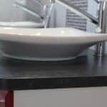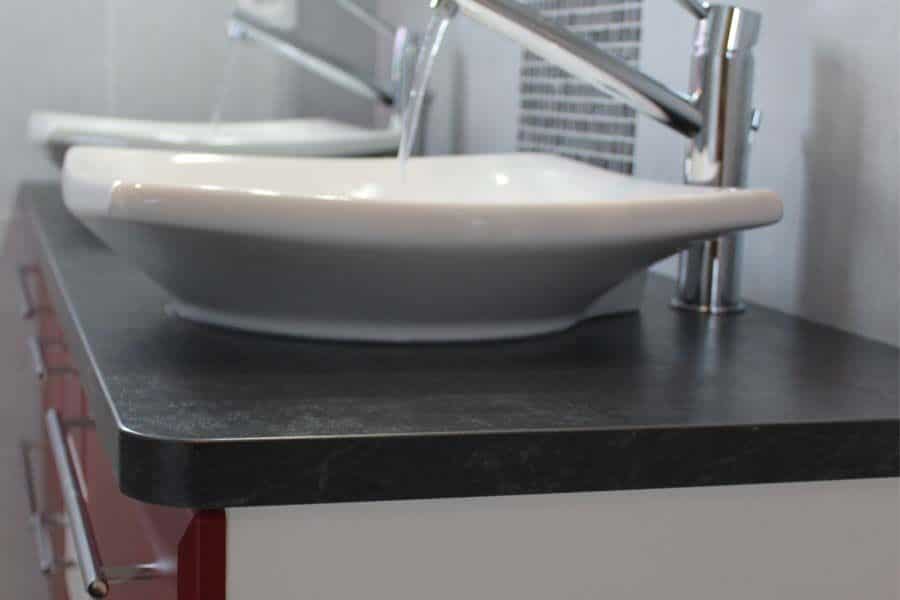 Plan de toilette stratifié avec angle arrondi et vasque à poser.