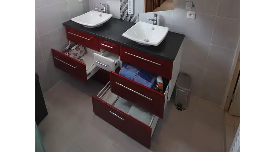 Meubles 2 grands tiroirs Optima façades Capri polymère rouge profond avec poignée bâton chromée.