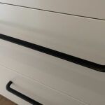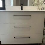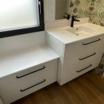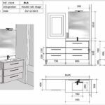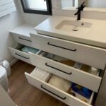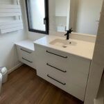Largeur 73,6 x hauteur 46,6 x profondeur 38 cm Profondeur tiroirs 35 cm Façades laquées satiné gris clair NCS S 1502-Y50R p5 – Caisson mélaminé blanc Fileur 10 mm coté mur. - Dessus meuble sous plan – Finition résine idem plan toilette