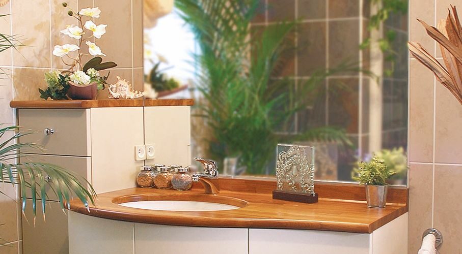 Plan toilette galbé avec dosseret usiné, teck lamellé vernis.