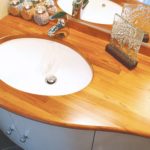 Plan toilette galbé avec dosseret usiné, teck lamellé vernis.