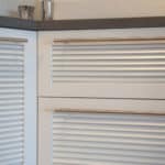 Meuble sous vasque 2 tiroirs et meuble 1 porte avec façades persienne blanc mat et poignées bâton nickel mat.